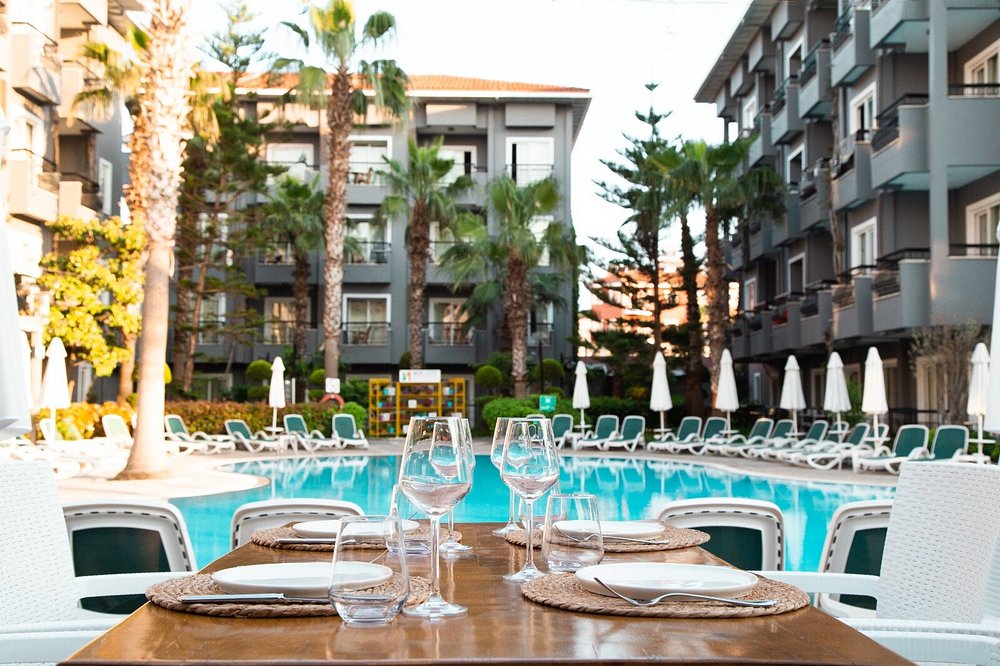 Usluga: All inclusive (sve uključeno) na bazi otvorenog bufea – samoposluživanje, izbor više vrsta jela (švedski sto) za doručak, ručak, popodnevna kafa, čaj i kolači, večera, sladoled u odredjenim terminima, domaća alkoholna (pivo, otvoreno vino, raki, vodka, dzin, brandy) i bezalkoholna pića od 10:00h do 22:00h. All inclusive koncept ne uključuje: uvozna i ostala domaća alkoholna pića, flaširana pića, sveže cedjene voćne sokove, specijalna vina, tursku kafu, pića posle 22:00h, hranu i pića na plaži.